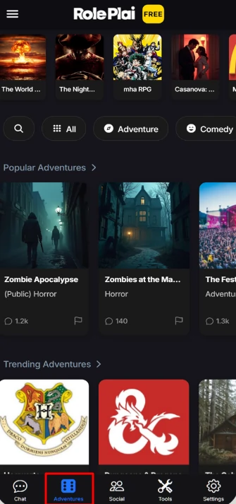 RolaPlai's AI Tryb Przygód pozwala Ci wcielić się w głównego bohatera rozgałęzionej opowieści. Wyobraź sobie romans, tajemnicę, fantasy i wszystko pomiędzy. Twoje wybory napędzają historię, a przygody możesz rozgrywać ponownie, podejmując różne decyzje i odkrywając alternatywne zakończenia. To w zasadzie książka typu „wybierz własną przygodę”, ale napędzana przez… AI i z o wiele większą liczbą opcji, aby poczuć się intymnie lub pójść na całość tryb fantasy.