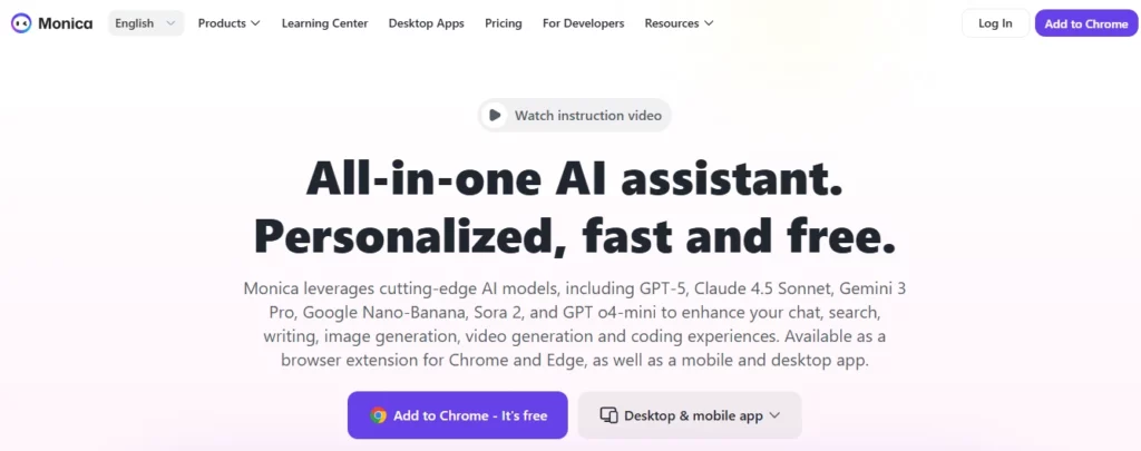 É compatível com GPT 5.2, Claude 4.5 Sonnet e Gemini 3 Pro, permitindo que os usuários alternem entre os modelos dependendo da tarefa. Para profissionais, freelancers e pesquisadores que buscam economizar tempo em tarefas digitais do dia a dia, Monica é ideal. AI elimina a necessidade de alternar entre separados AI Assinaturas e ferramentas. Com mais de 10 milhões de usuários, consolidou-se como uma das mais populares. AI extensões de navegador disponíveis no mercado.
