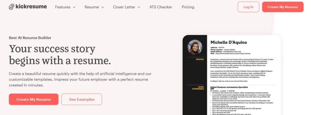 The resume examples library features over 1,500 real world samples sorted by industry and job title, giving users a concrete reference point. Combined with the Career Map prediction tool, Kickresume offers genuine strategic support for anyone navigating a major career transition or entering the job market for the first time.